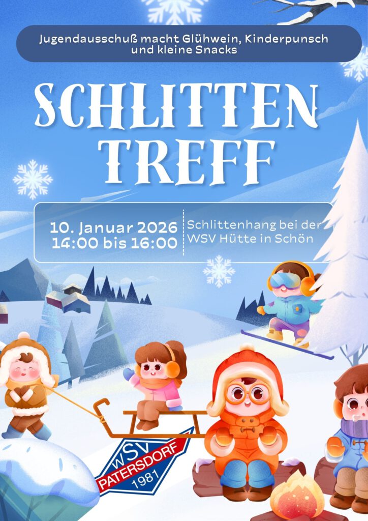 Am morgigen Samstag von 14:00 bis 16:00 Uhr schenkt der Jugendausschuß Kinderpunsch und Glühwein am präparierten Schlittenhang bei der WSV Hütte in Schön aus. Es gibt auch kleine Snacks. Eltern und Kinder mit ihren Schlitten sind herzlich willkommen.